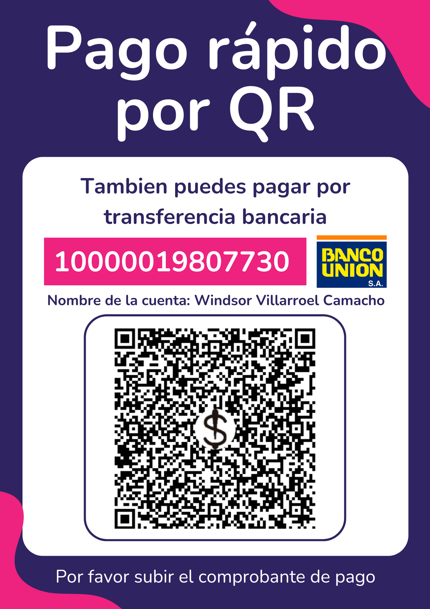 Realiza tu pago por transferencia bancaria o mediante QR. Los datos están en la imagen de abajo. Una vez confirmado el pago, se habilitará tu acceso al curso. ¡Gracias por tu compra!